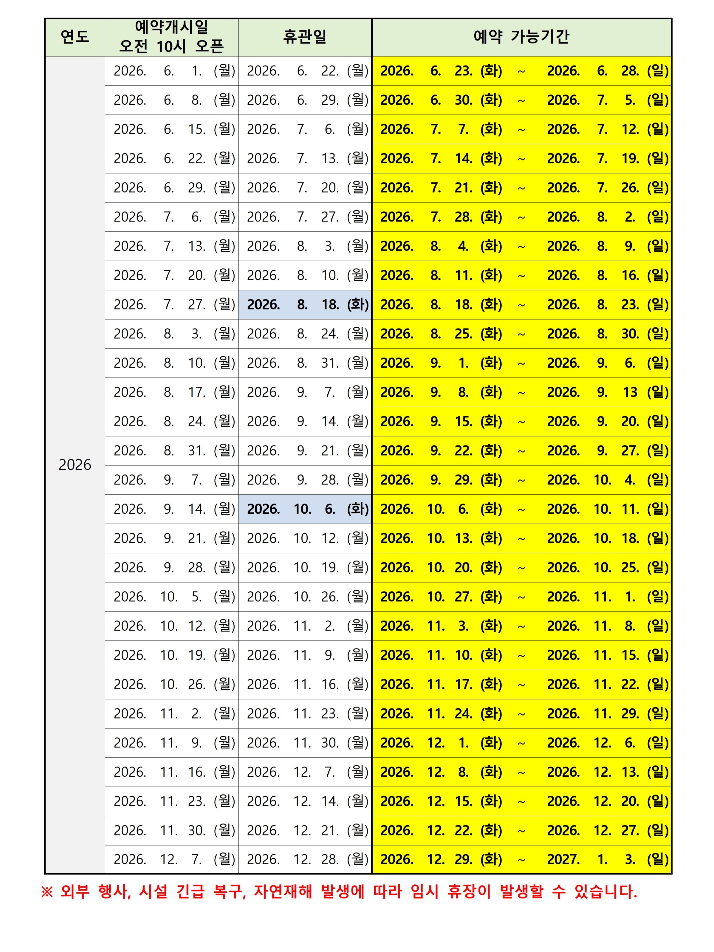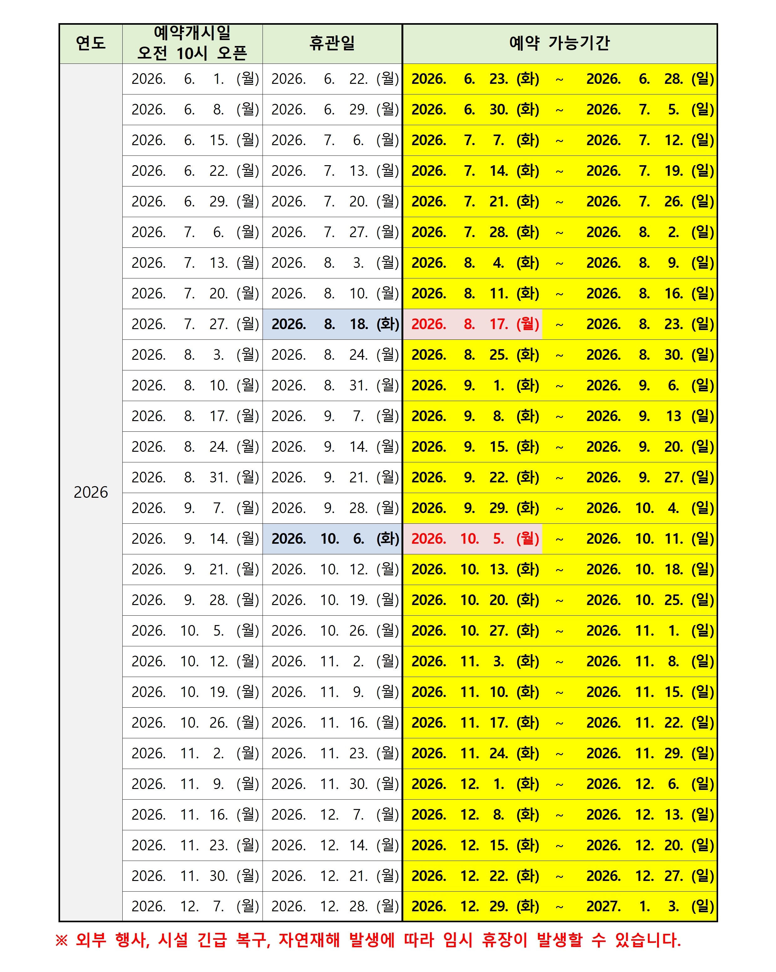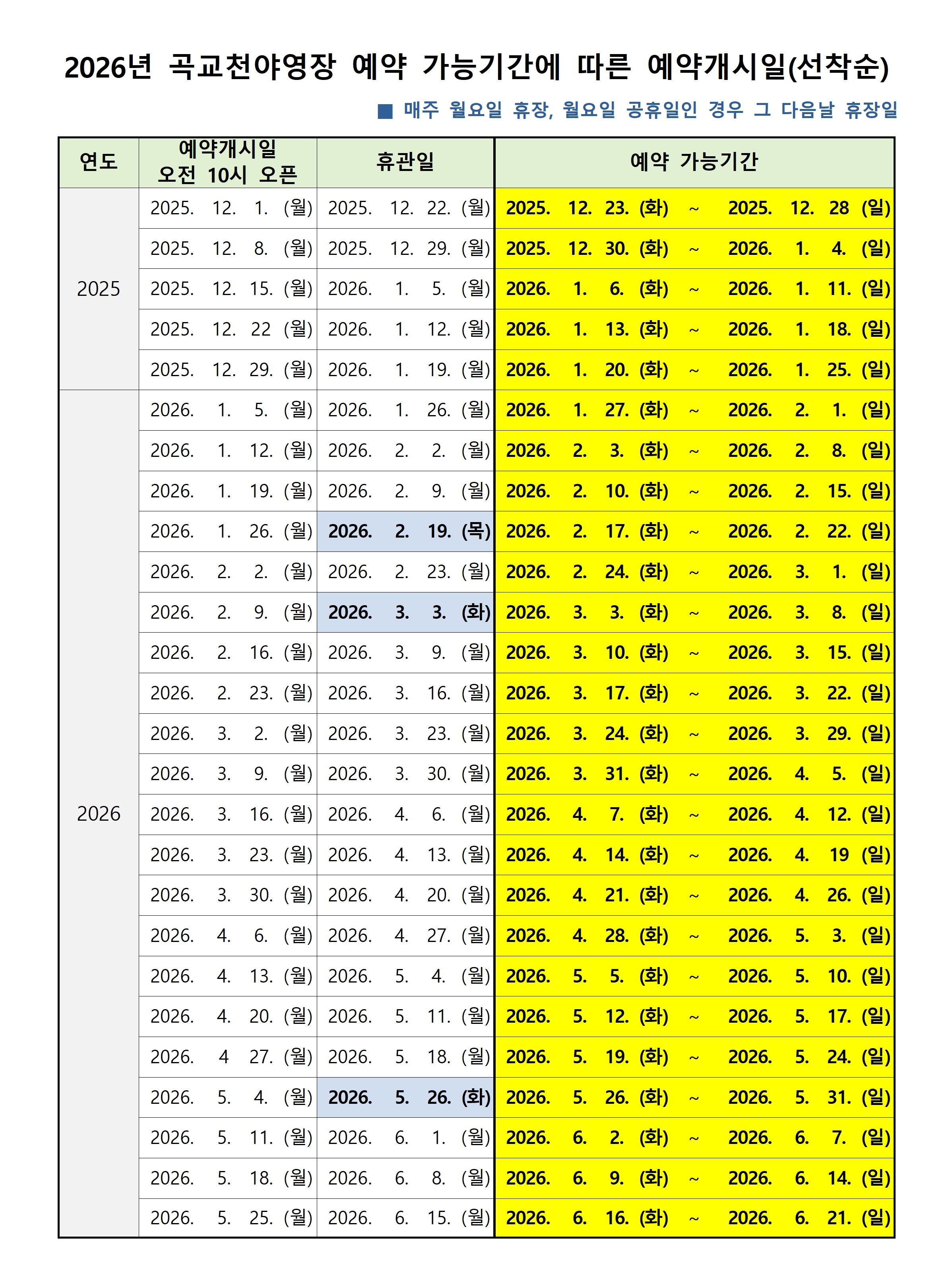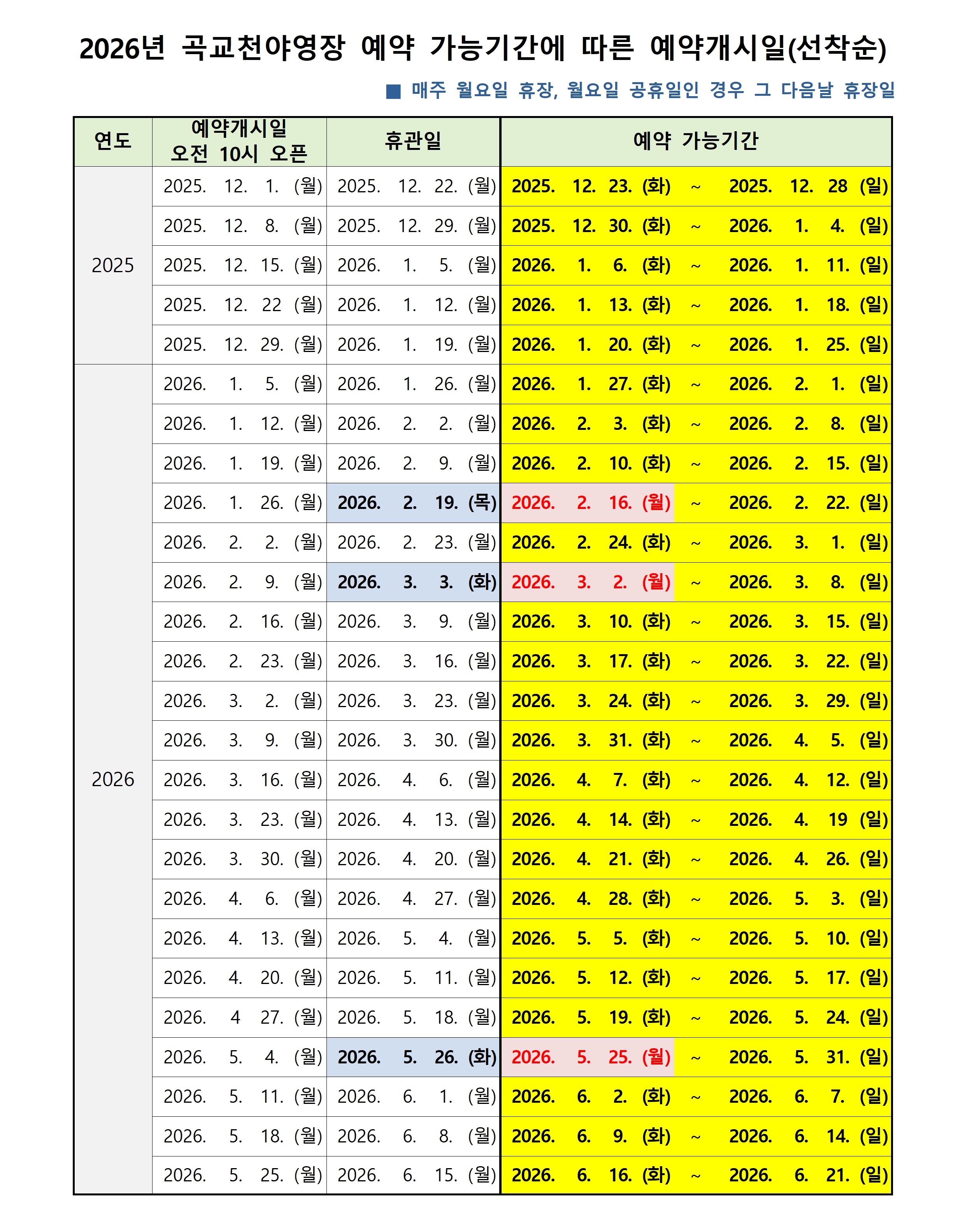 2026년 곡교천야영장 예약 가능시간에 따른 예약개시일(선착순)